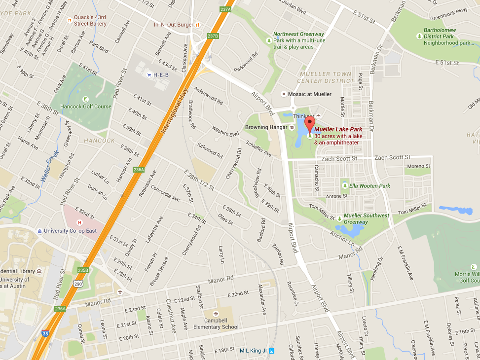 Mueller Lake Park, right off of 35, next to Airport Blvd and Manor. If you spot an old air traffic control tower, you’re in the right area.